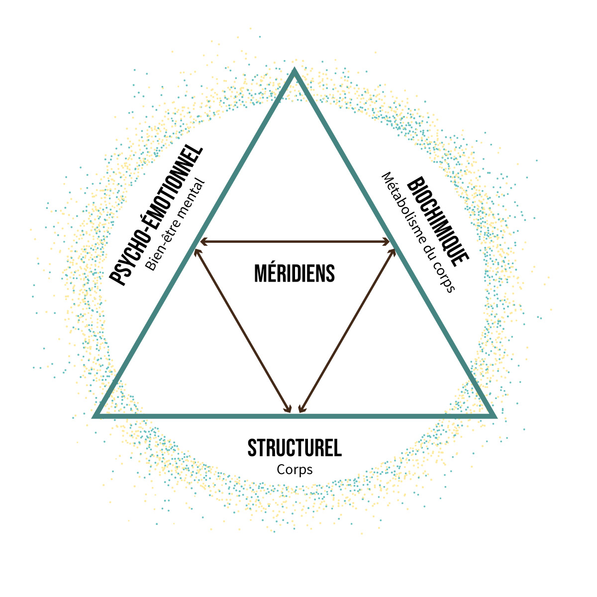 Notre corps est composé de 3 dimensions : l’émotionnel, le biochimique et le structurel. Ces 3 dimensions sont connectées entre elles par les méridiens ( circuits énergétiques ). Si l’une de ses dimensions est perturbée, elle impacte les autres.